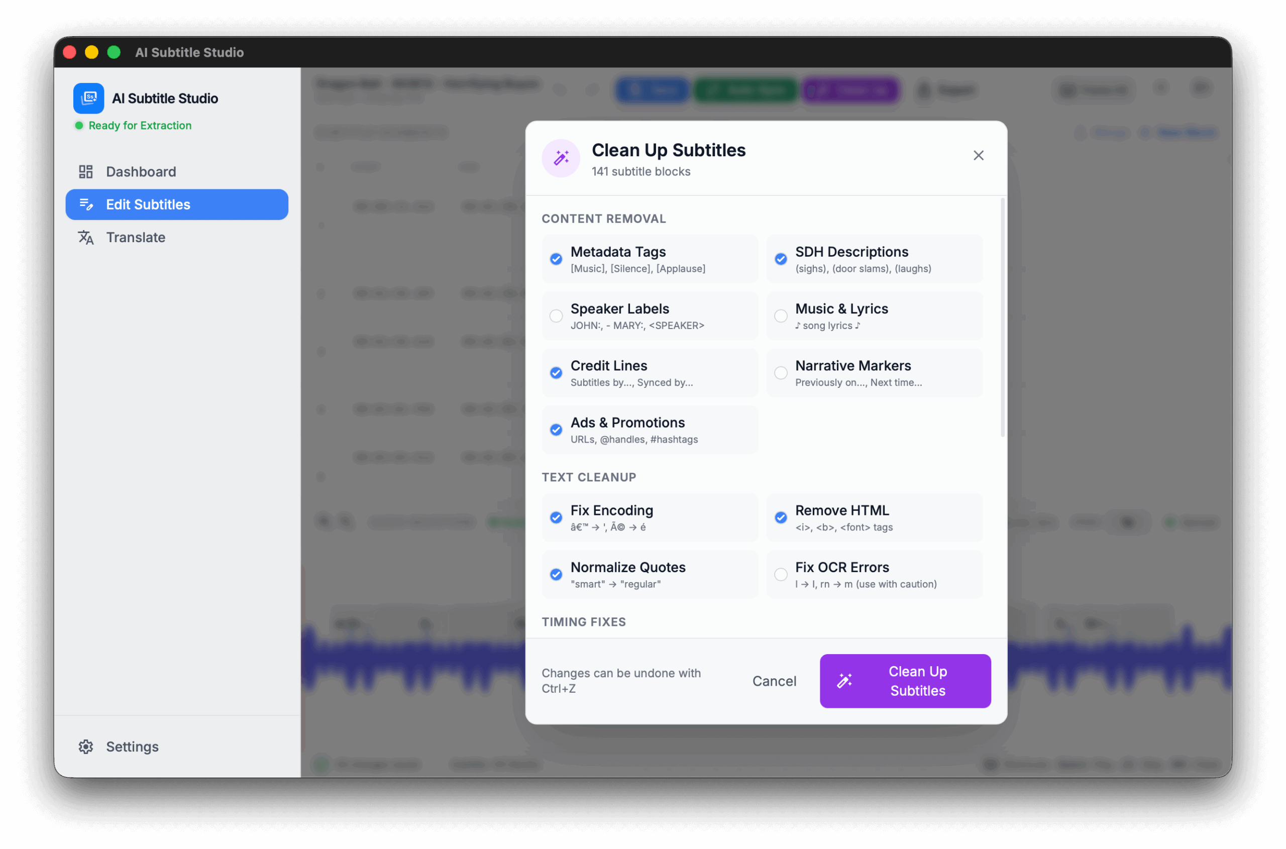 Remove SDH & Metadata – Strips out non-dialogue descriptions like [Music playing] or (Door slams) with one click.