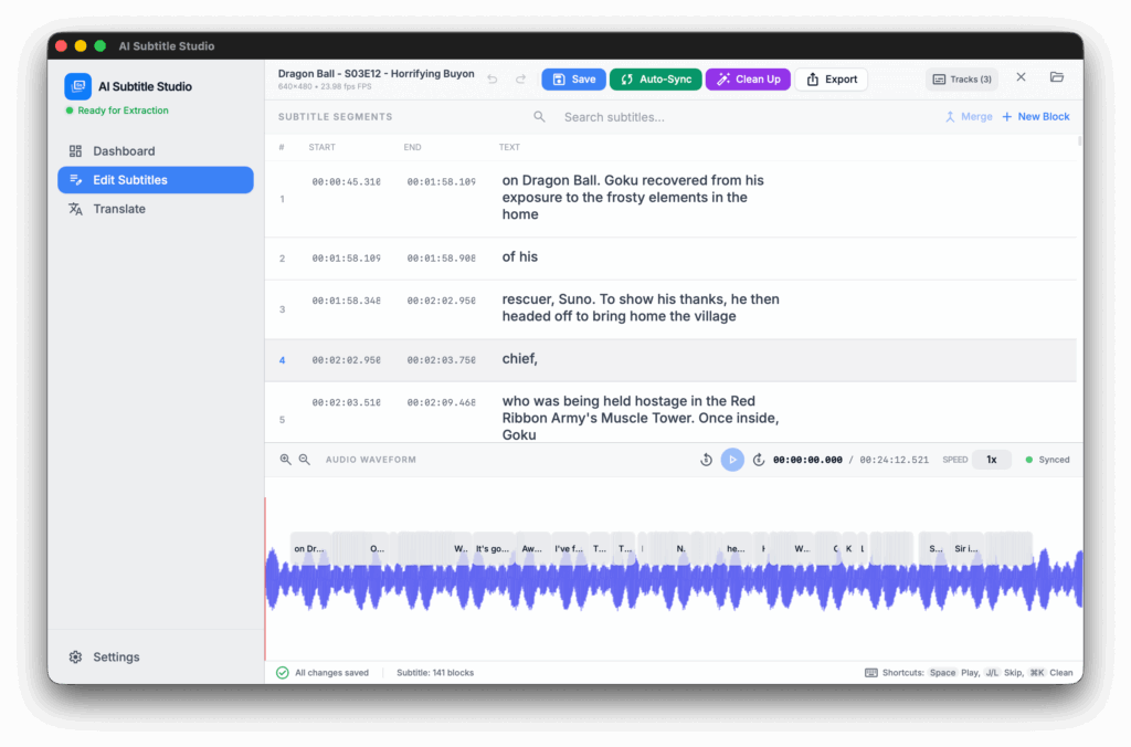 If your subtitle file doesn’t match your video, AI Subtitle Studio includes a specialized Subsync integration to fix timing issues automatically.