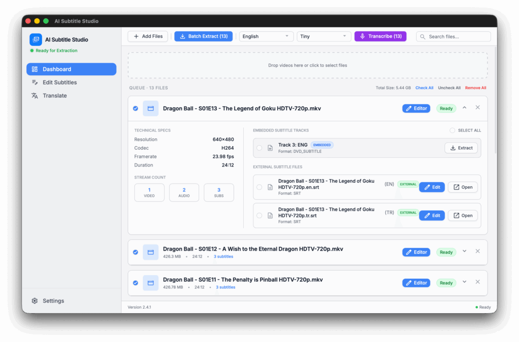 Batch processing – Drag and drop folders into the app and click the Create button to start batch generating subtitles. Ideal for TV Shows